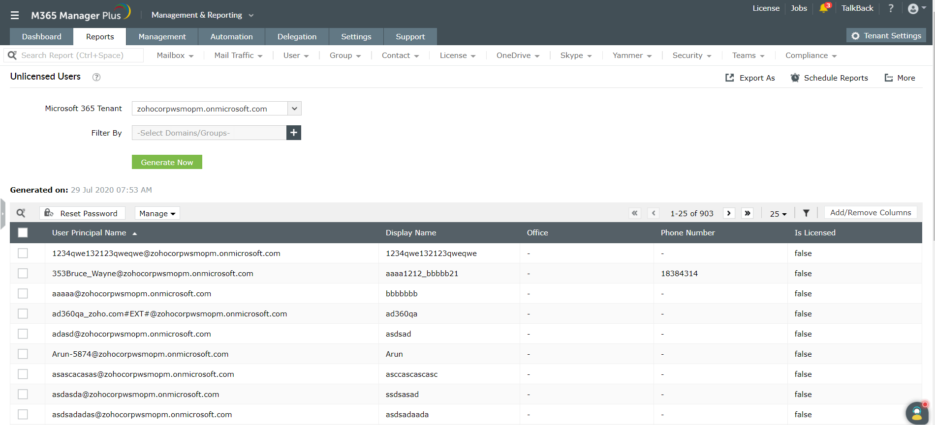 Dzięki M365 Manager Plus,kompleksowemu rozwiązaniu dla pakietu Microsoft 365,raporty te mogą być tworzone w zaplanowanych odstępach, wysyłane w wiadomości e-mail do administratorów oraz eksportowane do plików w formacie CSV, XLS (Microsoft Excel), PDF (Adobe Acrobat) lub HTML.