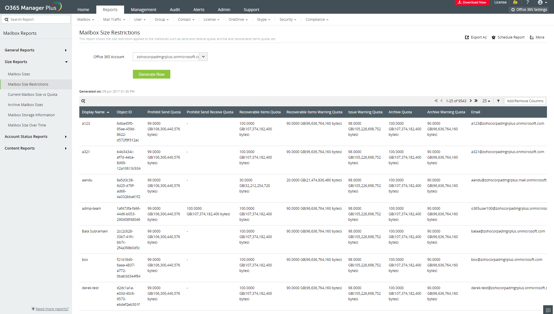 Raporty te zapewniają obszerny podgląd wszystkich informacji związanych z rozmiarami skrzynek pocztowych Exchange Online w organizacji. Dzięki danym w czasie rzeczywistym dla wielu kwestii, od limitów przydziału dla użytkowników końcowych do poziomów aktywności i wykorzystania e-maili raporty te pomagają zapobiegać wymykającym się spod kontroli skrzynkom pocztowym.