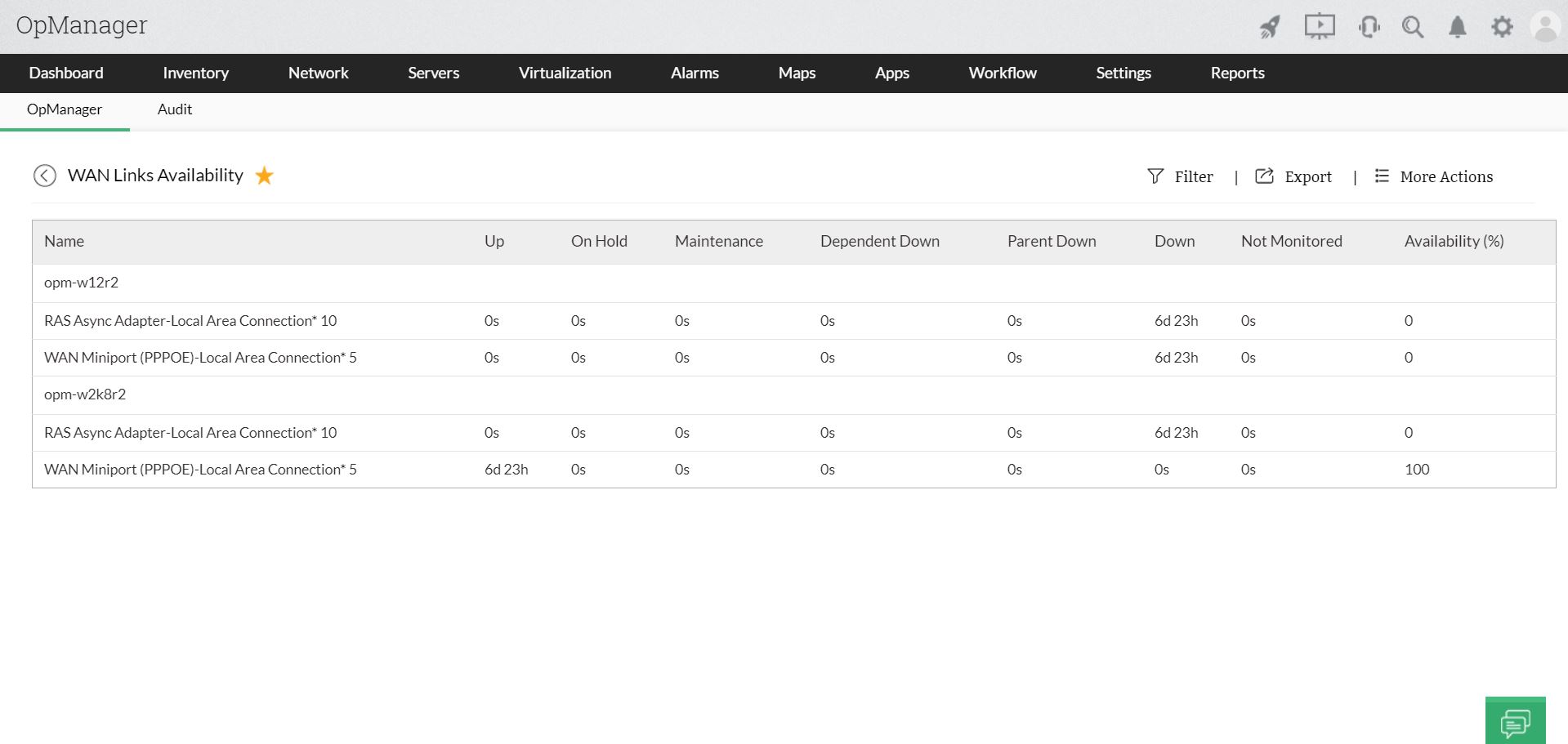OpManager monitoruje przepustowość, wykorzystanie, błędy i odrzucenia łączy WAN i w ten sposób pomaga w spełnieniu warunków umów dotyczących poziomu usług (SLA) z dostawcami usług internetowych (ISP). Przez przedstawienie dokładnych informacji o ruchu i wykorzystaniu dla każdego z łączy twojego WAN, można identyfikować intensywnie wykorzystywane i mało wykorzystywane łącza pozwalając na optymalizację przepustowości w nich.