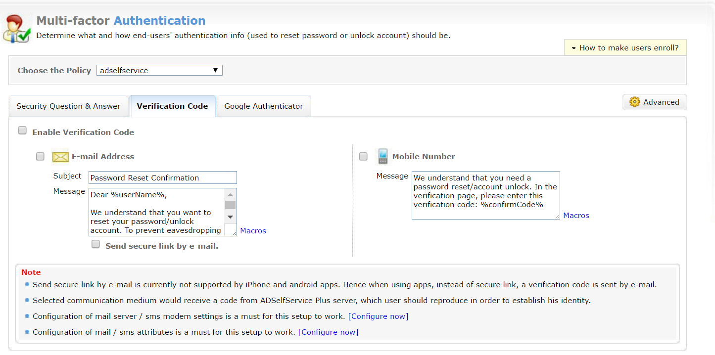 Kiedy użytkownik próbuje zresetować hasło lub odblokować konto, to na jego lub jej numer telefonu komórkowego lub adres e-mail wysyłany jest kod weryfikacji. Administratorzy mają również możliwość wysłania w wiadomości e-mail bezpiecznego łącza pozwalającego na zresetowanie hasła. Administratorzy mogą skonfigurować liczbę nieprawidłowych prób, po których użytkownikowi zostanie tymczasowo zablokowana możliwość zalogowania się.